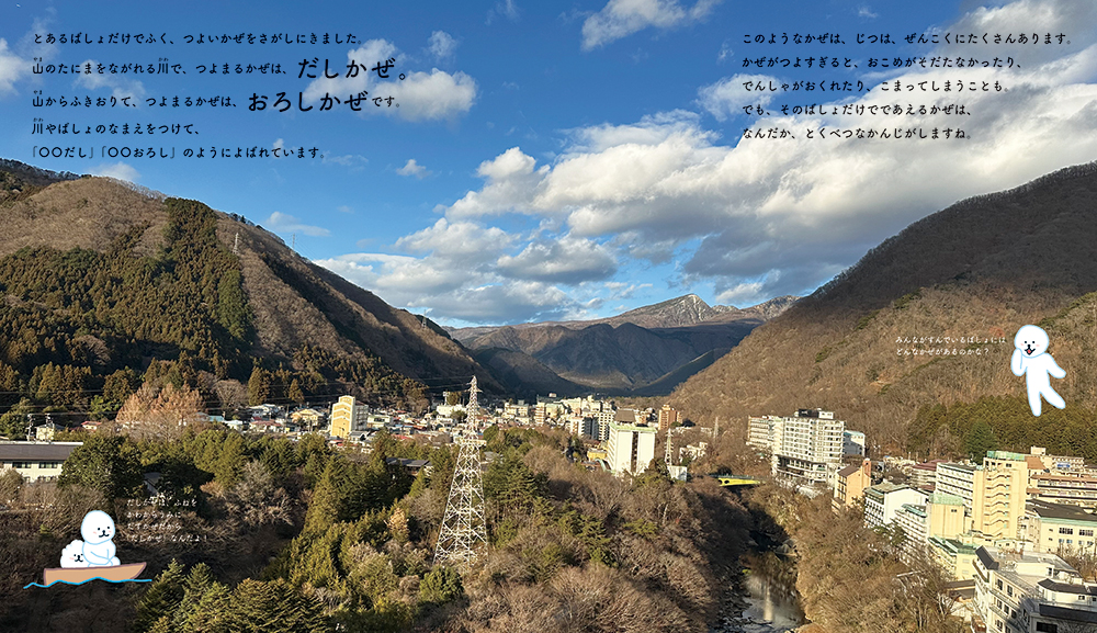 偏西風・台風・季節風・突風など、風の種類にはどのようなものがあるのか、「六甲おろし」などに見られる「おろしかぜ」「だしかぜ」などの風の呼び方や、風紋、風力発電など、風の力がもたらすものについて、風を可視化してさぐります。