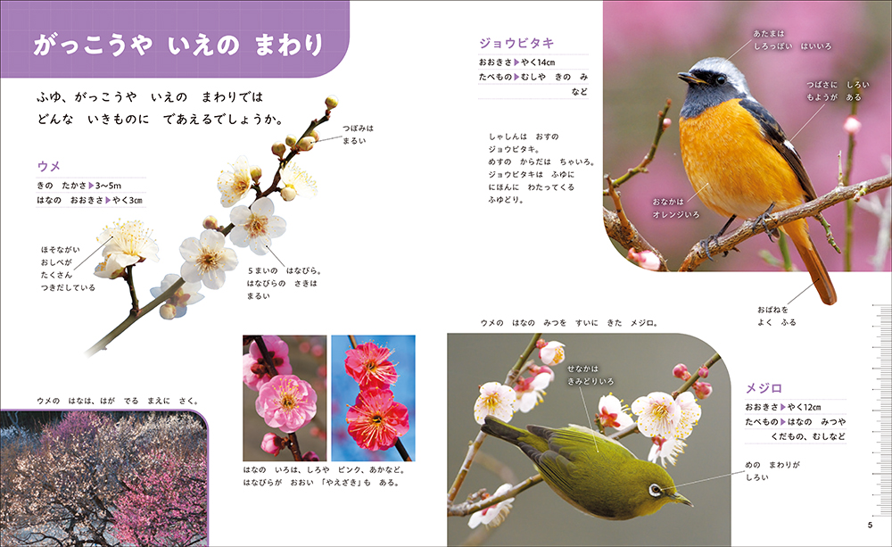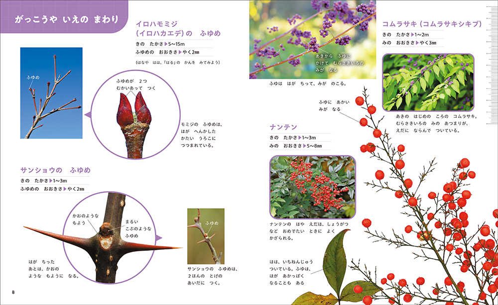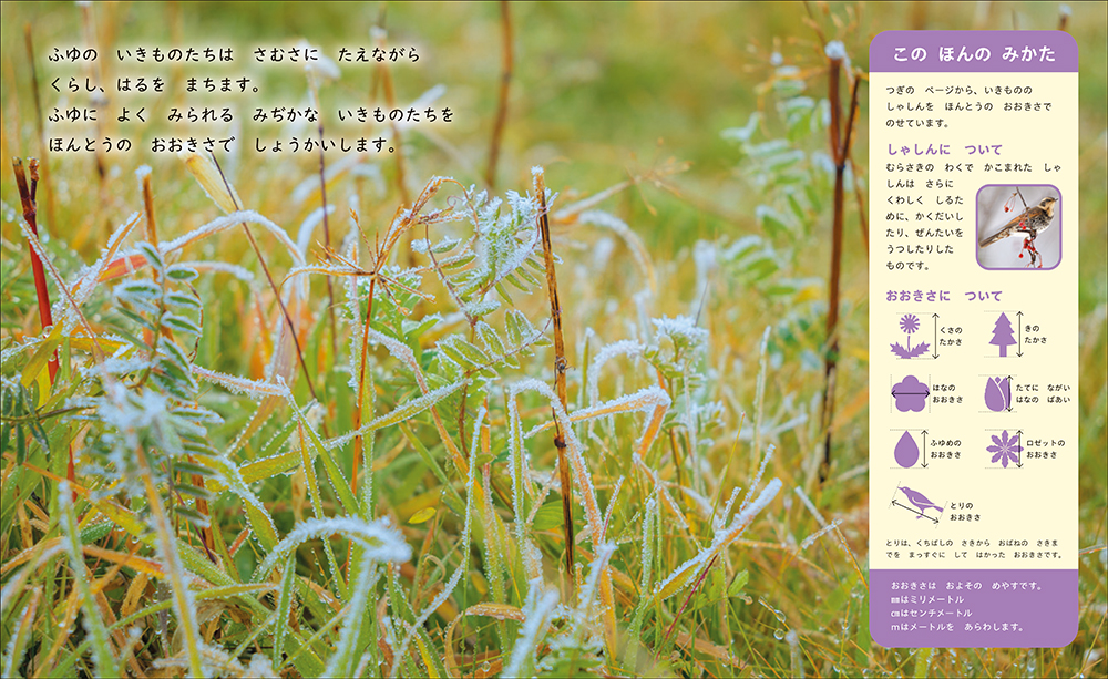 ナンテン、ポインセチア、シクラメン、ススキ、サクラの冬芽、ジョウビタキ、メジロなど、身近な冬の生き物の実物大がわかる図鑑。
