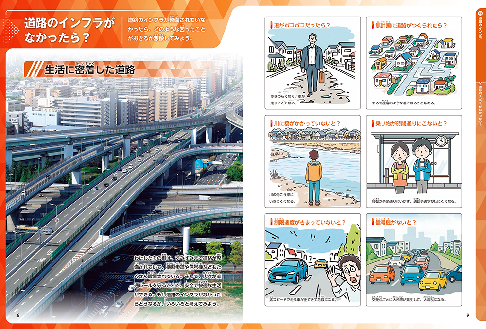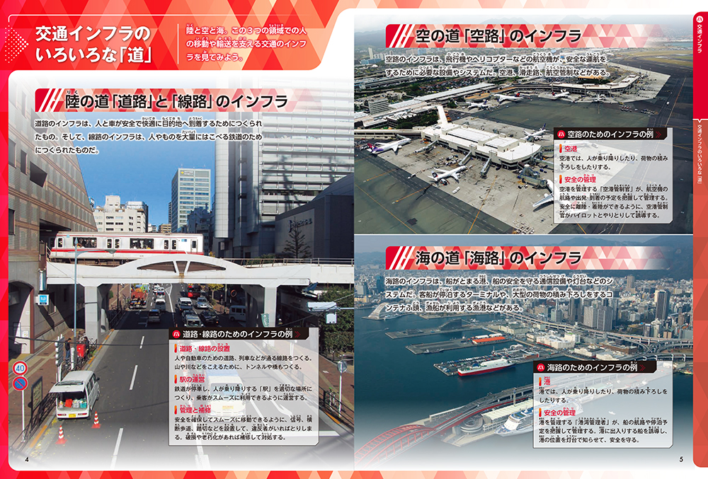 もし道路や鉄道が整備されていなかったら、どうなるでしょう。私たちの命と暮らしを支えているのがインフラです。交通に関するインフラには何があって、どのように運用されているのか、豊富な写真やイラストで解説。