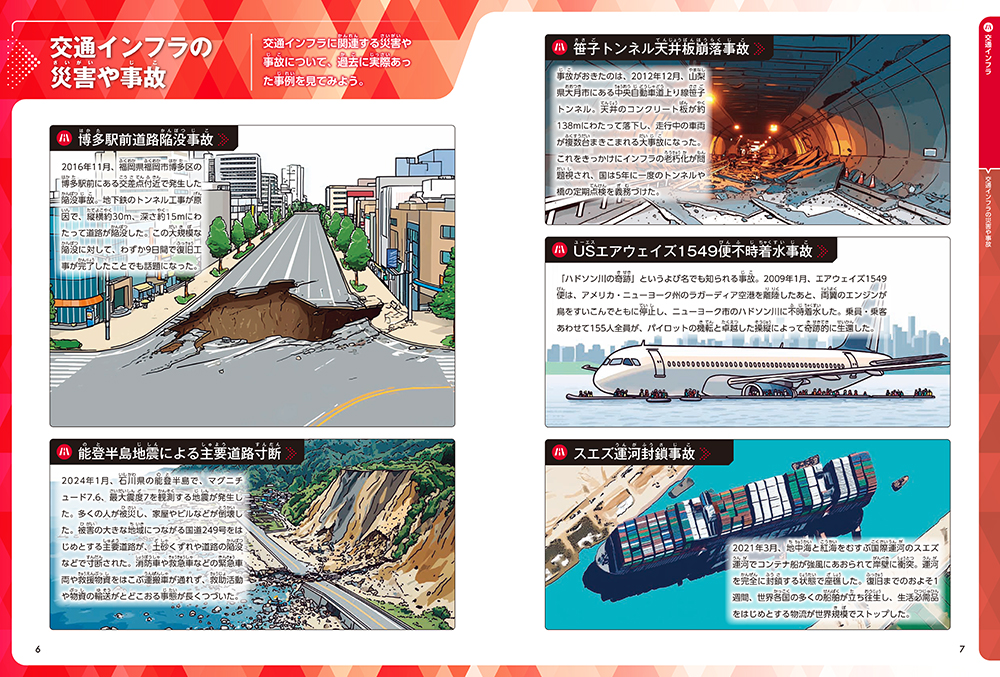 交通インフラの災害や事故/道路のインフラがなかったら?/道路インフラを支える仕事/道路インフラの歴史/道路インフラの保守/鉄道がになう役割や目的/鉄道インフラを支える仕事/鉄道インフラの保守/空路をすすむ空のインフラ/海路をすすむ海のインフラ/インフラ社会科見学/ Q&A 豆知識 ほか