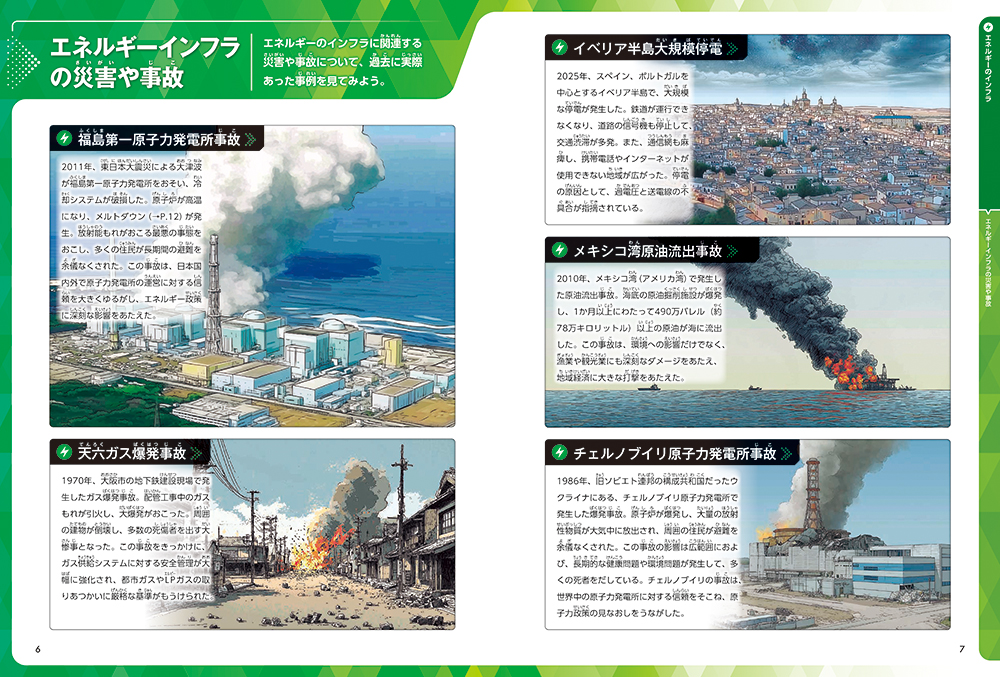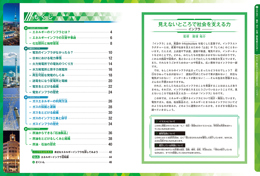エネルギーインフラの災害や事故/電気のインフラがなかったら?/日本における電力事情/火力発電所での電気のつくり方/水力発電所と原子力発電所/再生可能な発電のしくみ/ガスエネルギーの利用方法/原油からできる「石油製品」/原油をとどけるしくみと組織/インフラ社会科見学/ Q&A 豆知識 ほか