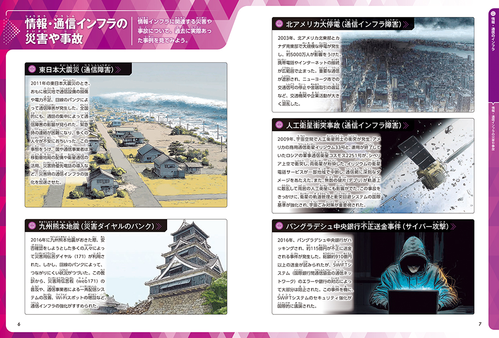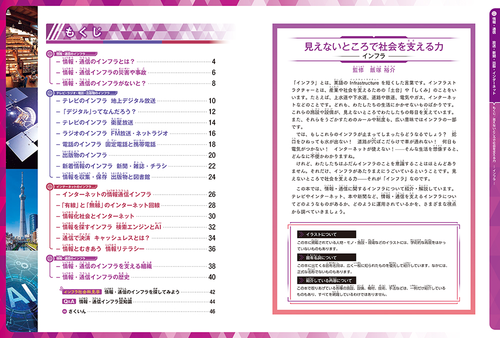 情報・通信インフラの災害や事故/情報・通信のインフラがないと?/テレビのインフラ 地上デジタル放送/「デジタル」ってなんだろう?/電話のインフラ 固定電話と携帯電話/出版物のインフラ/情報化社会とインターネット/情報とむきあう 情報リテラシー/インフラ社会科見学/ Q&A 豆知識 ほか