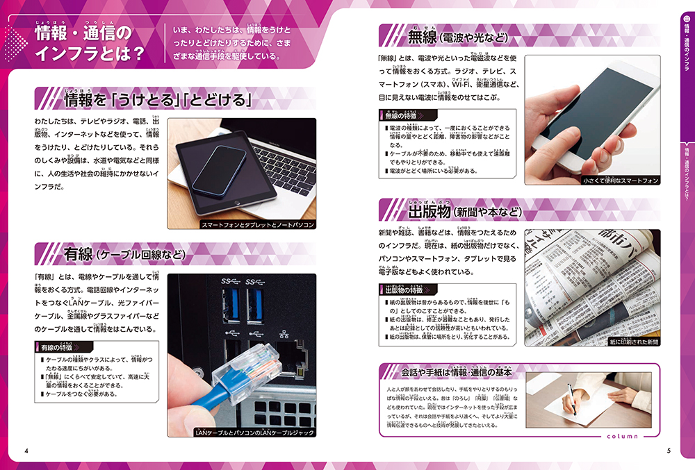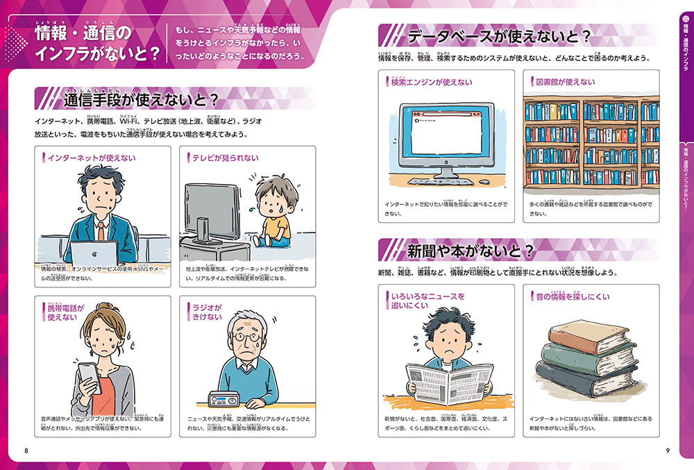もしテレビや電話やインターネットがなかったらどうなるでしょう。私たちの命と暮らしを支えているのがインフラです。情報や通信に関するインフラは何があってどう運用されているのか、豊富な写真やイラストで解説。
