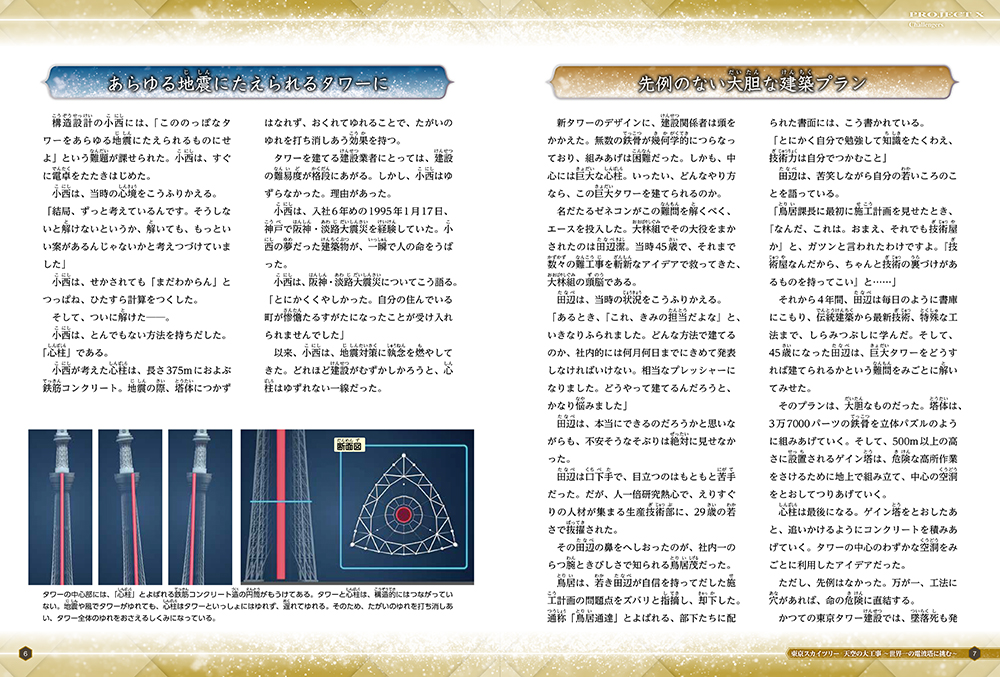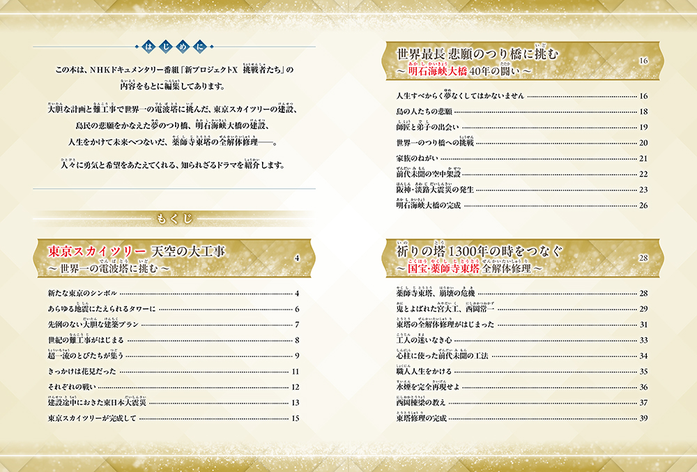 大胆な計画で世界一に挑む東京スカイツリー建設、島民悲願の、明石海峡大橋建設、薬師寺東塔大修理の話を収載。