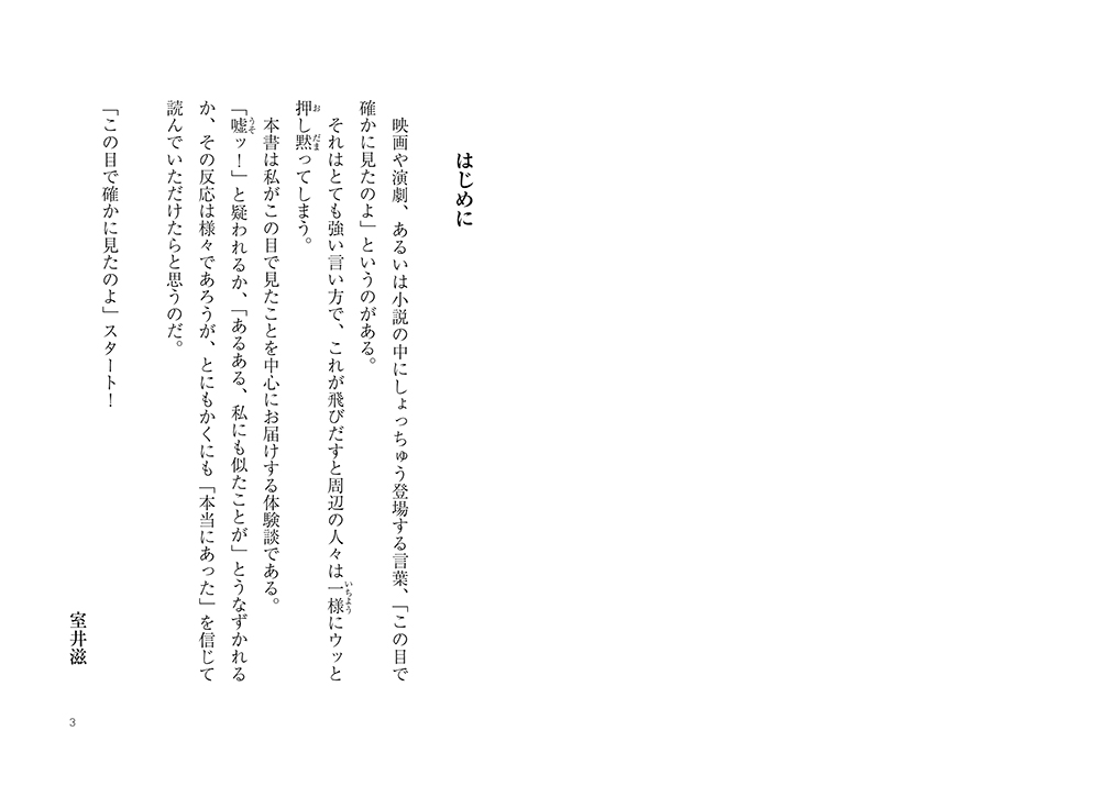 映画や演劇、あるいは小説の中にしょっちゅう登場する言葉、「この目で確かに見たのよ」というのがある。それはとても強い言い方で、これが飛びだすと周辺の人々は一様にウッと押し黙ってしまう。本書は私がこの目で見たことを中心にお届けする体験談である。「嘘ッ!」と疑われるか、「あるある、私にも似たことが」とうなずかれるか、その反応は様々であろうが、とにもかくにも「本当にあった」を信じて読んでいただけたらと思うのだ。「この目で確かに見たのよ」スタート!