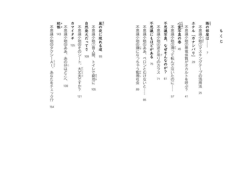 室井滋本人や周りの人たちに起こる怖い出来事や不思議な現象など、日常の中の非日常を綴る書き下ろし短編「隣の部屋は……」「ホテル『カナシバリ』」「心霊写真の巻」など9編と、エッセー「不思議小咄」10編を収録。